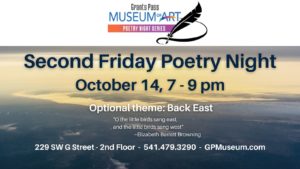 Second Friday Poetry Sharing October 14, 2022 7 PM to 9 PM Grants Pass Museum of Art event 229 SW G Street - 2nd Floor Free Admission - donations appreciated Read poetry and/or listen to others. Mark your calendar for every second Friday of the month, and join us. This month's optional theme is Back East.