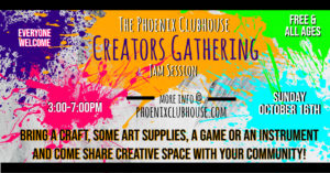 Thanks to the continued support from the community we have met our goal in the "Jam Jar" again and will be hosting another Creators Gathering & Community Jam Session at The Phoenix Clubhouse. Sunday, October 16th, 2022 3:00-7:00pm FREE ~ ALL AGES ~ EVERYONE WELCOME This event provides space and time for local artists, musicians and community members to get together to network, create and collaborate. The stage will be set up with drums and amps for people wanting to…